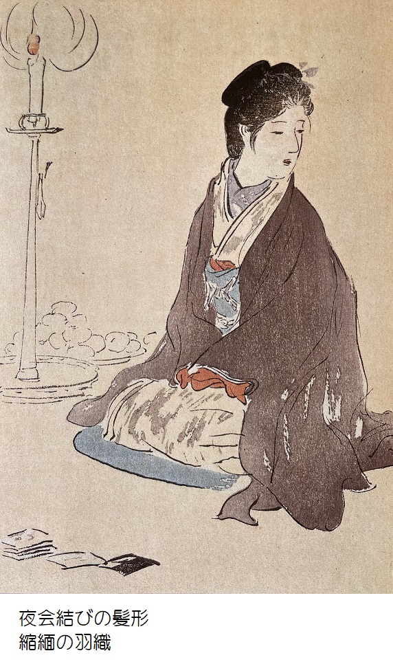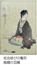 〇夜會結/夜会結び(やかいむすび)/夜会巻き(やかいまき) ・・・ 髪形の一種。鹿鳴館時代に流行した女性の束髪。後頭部で髪を束ね、頭頂の方へ左右からねじり合せてピンで留めた髪形。