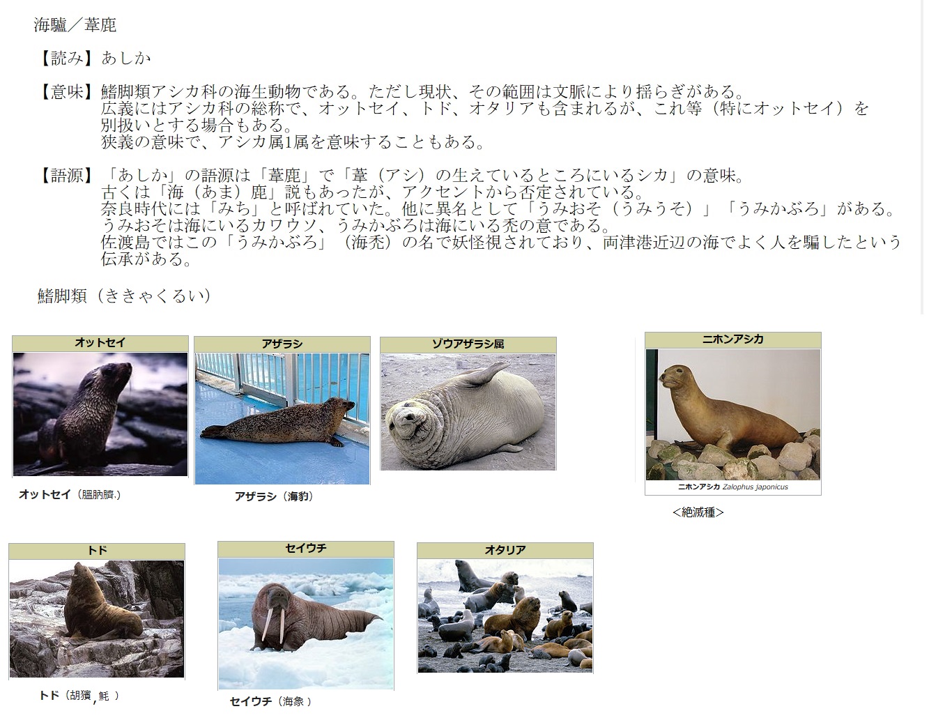 あしか | 海生動物。広義にはオットセイも含まれる | 解説 |
