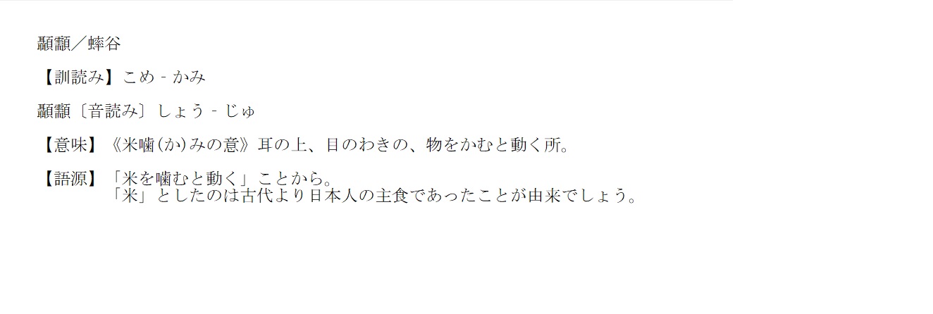 こめかみ | 耳の上、目のわきの、物をかむと動く所 | 解説 |