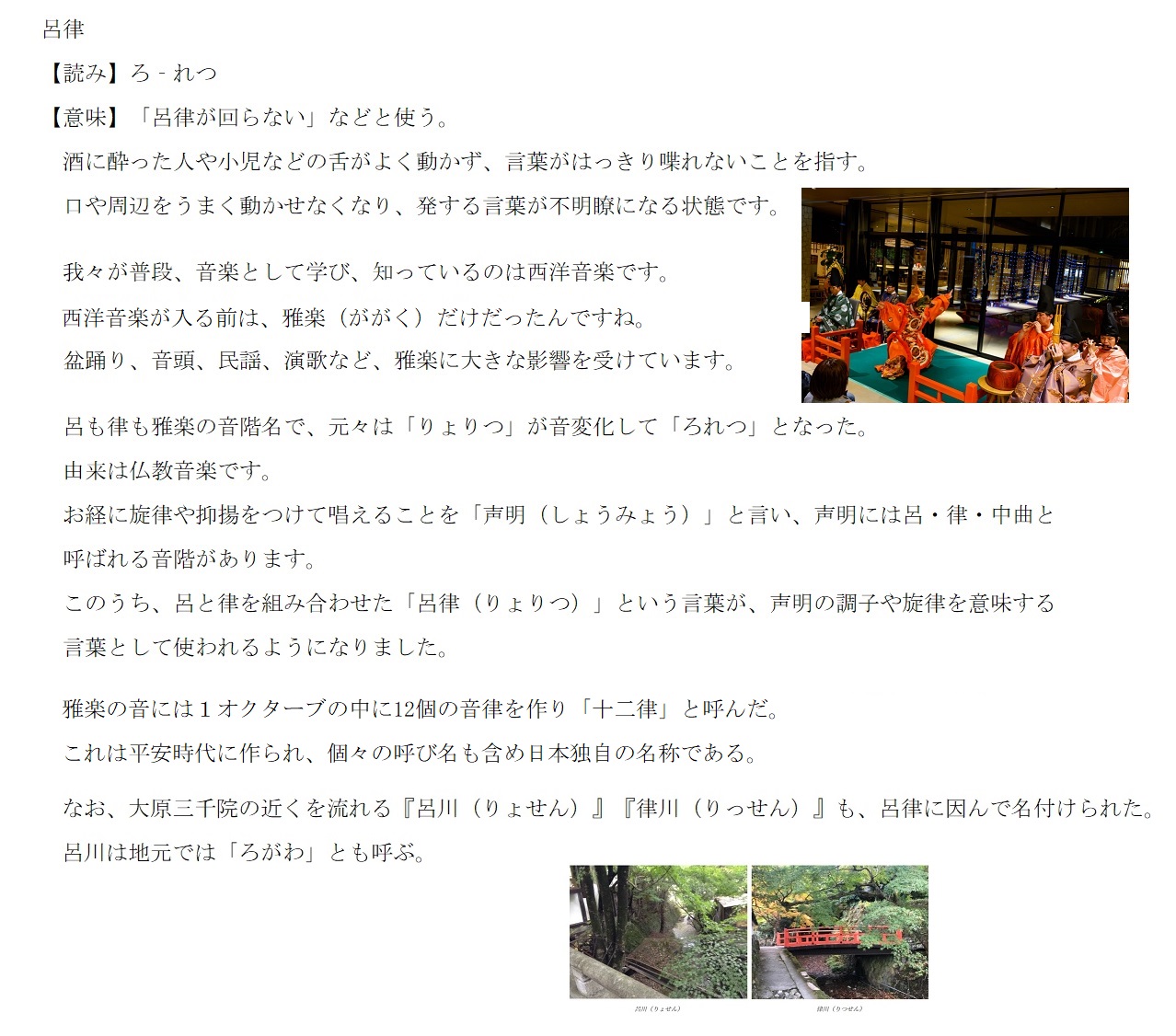 ○呂律(ろれつ) ・・・ ≪「りょりつ」が音変化したもの≫ 物を言うときの調子。言葉の調子。〔詳細説明〕