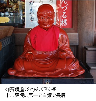 御賓頭盧(おびんずる)様は、十六羅漢の第一で白頭で長眉をそなえる。