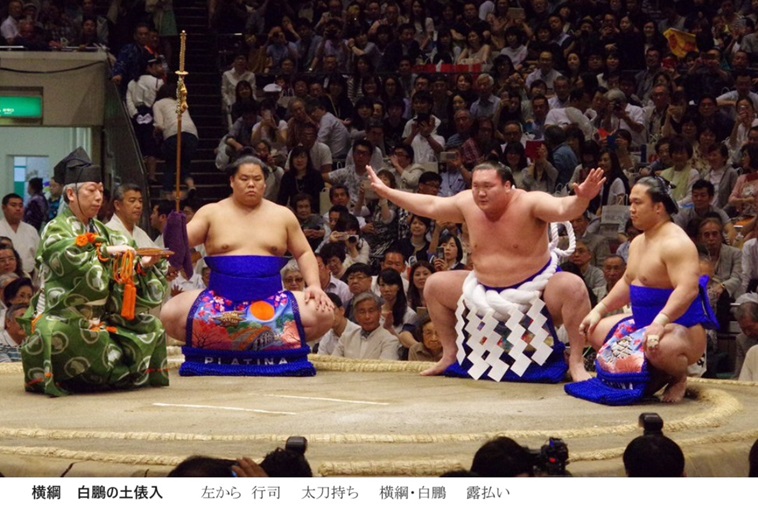 立呼出および立行司に先導され、純白の綱を腰に締めた横綱が、露払いと太刀持ちを従えて入場する。