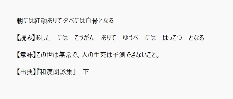 | 6 | 朝にコウガンありて夕べに白骨となる | |