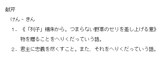 けんきん | 物を贈ることを表す謙譲語。「歳暮の品を献芹する」 | 故事 |
