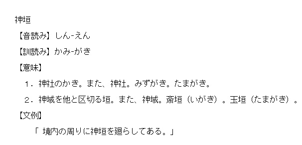しんえん | 神社のかき。神域を他と区切る垣。 | 解説 |