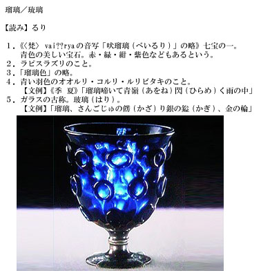 るり | ガラスの古称。琉璃(るり)。玻璃(はり)。 | 解説 |