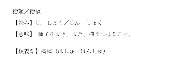 はしょく/はんしょく | 種をまいたり、苗を植えつけたりすること。 | 解説 |
