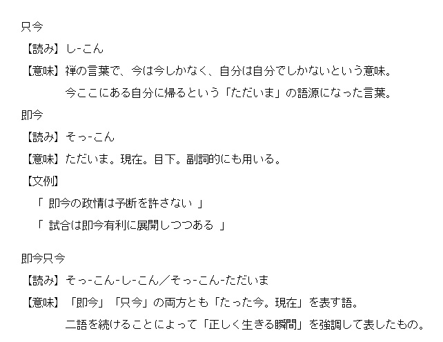 しこん | たった今。現在。<禅>自分は自分でしかない。 | 解説 |
