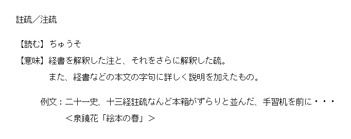 ちゅうそ | 経書などの本文の字句に詳しく説明を加えたもの。 | 解説 |