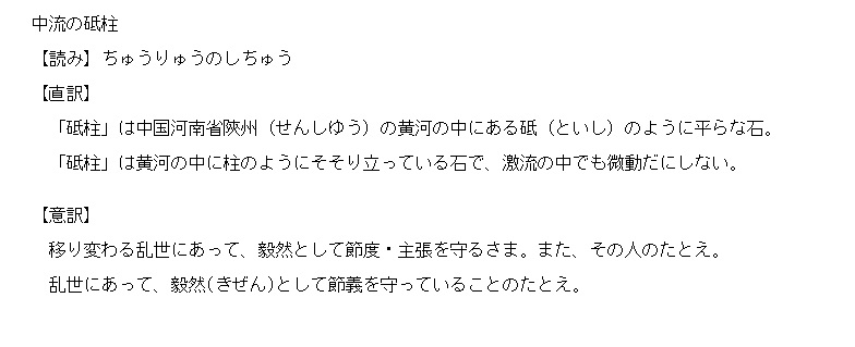 しちゅう | 黄河の中に柱のようにそそり立っている石。 | 解説 |