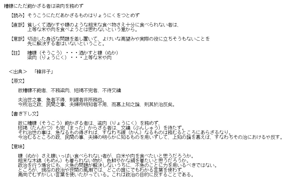 | 5 | 糟糠にただ飽かざる者は梁肉を務めず | |