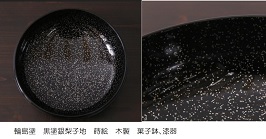 梨子地(なしじ) ・・・ 蒔絵の一種。漆塗りの面に梨子地粉を蒔き、梨子地漆を塗って粉を覆い、粉を研ぎ出さずに漆を透かして見せる法。