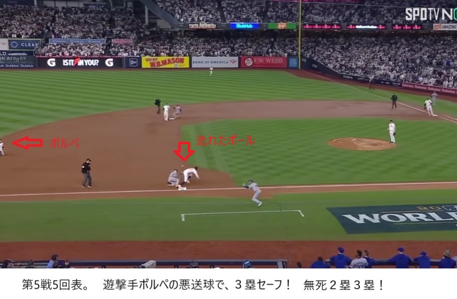 5回表、ジャッジの落球に始まり、ボルぺの悪送球で無死満塁になった。
