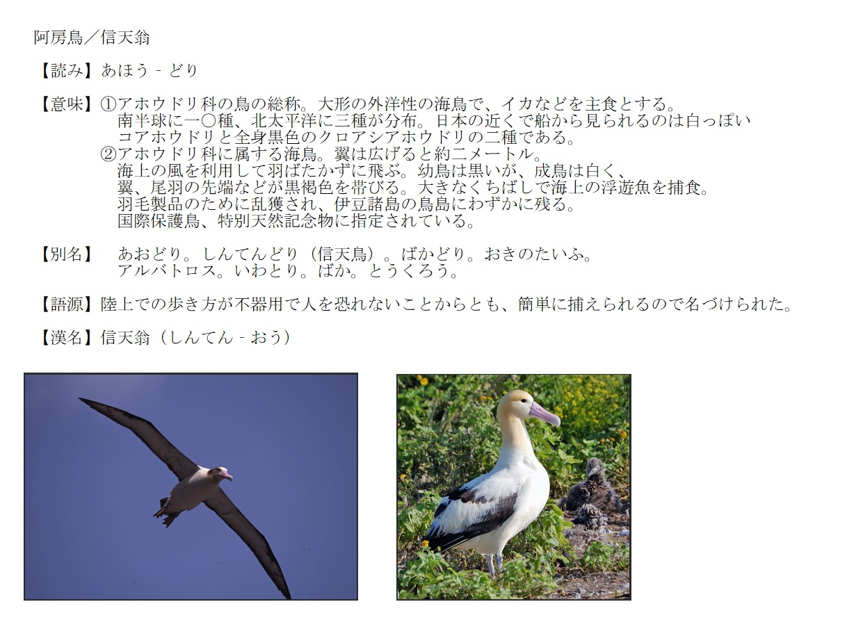 あほうどり | 「阿房鳥」とも書く。海鳥。 |