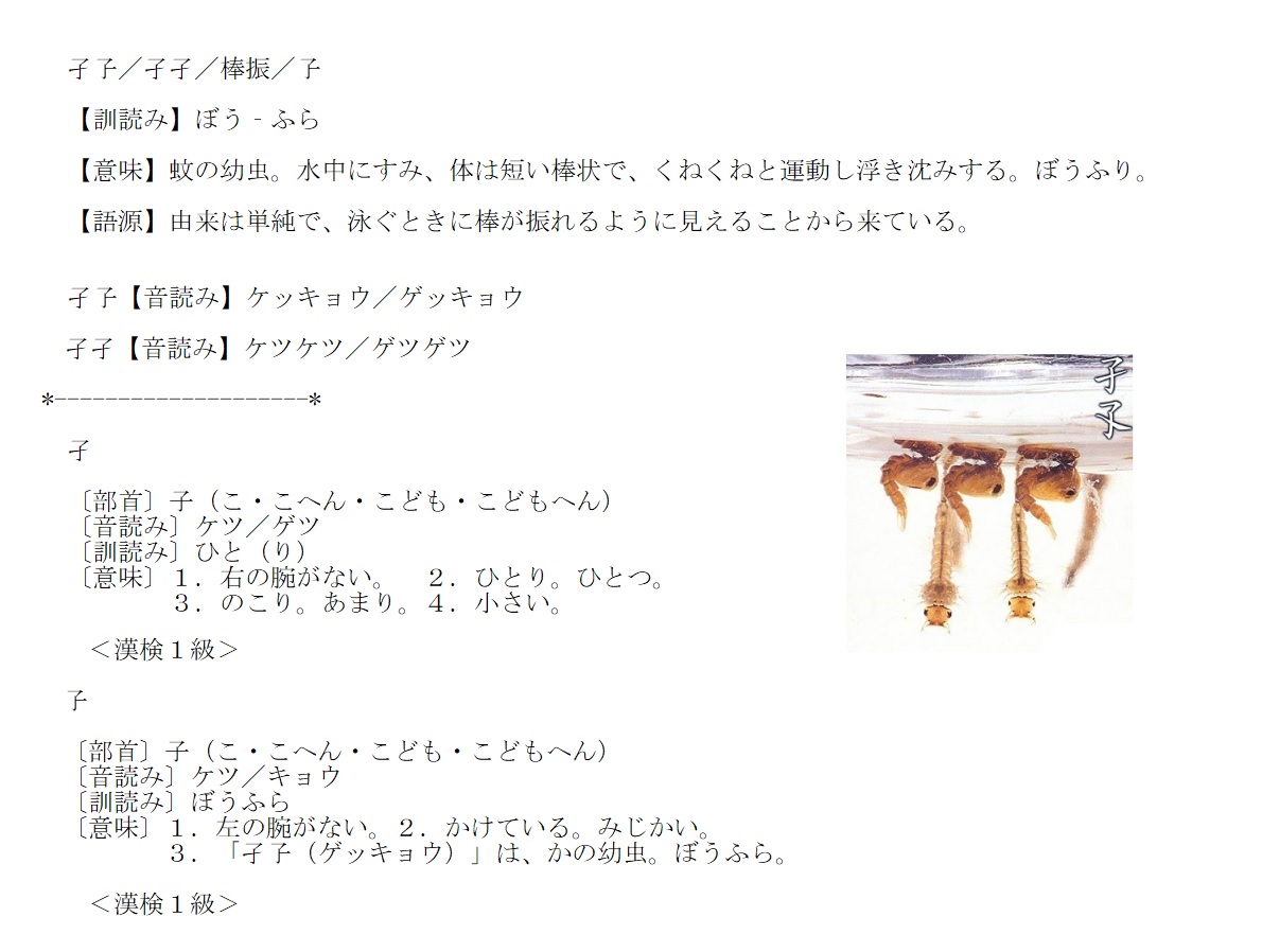 ぼうふら | 蚊の幼虫。水中にすみ、体は短い棒状 | 解説 |