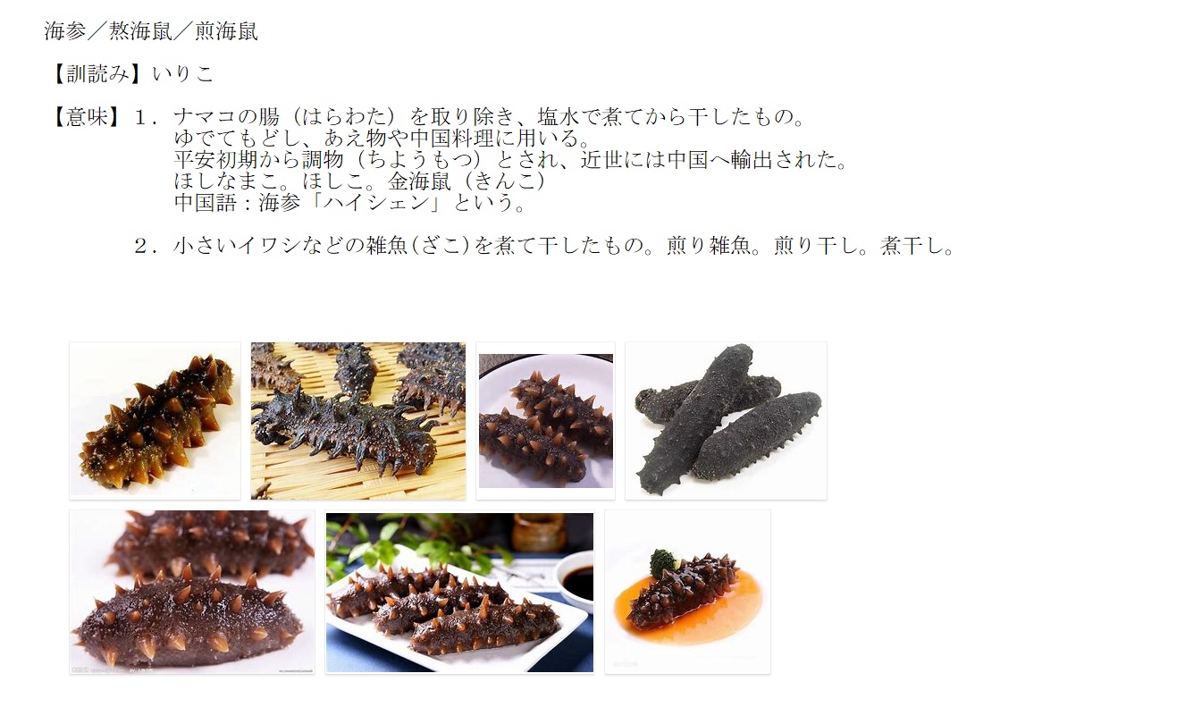 いりこ | ナマコの腸を取り除き、煮て干したもの | 解説 |