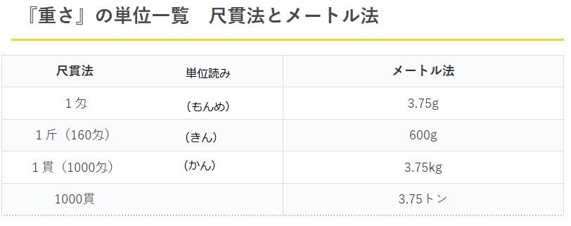 匁 | 1匁=3.75g。1貫=3.75kg | 解説 |