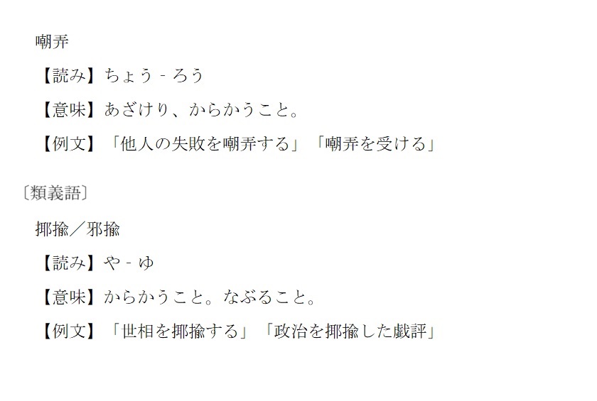 揶(邪)揄 | ちょうろう ≒ やゆ | 解説 |