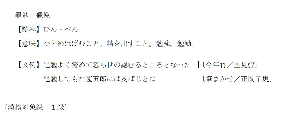 びんべん | つとめはげむこと。精を出すこと。勉強。勉励 | 解説 |