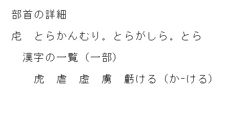 虍 | とらかんむり。<熟語>捕虜 | 詳細 |