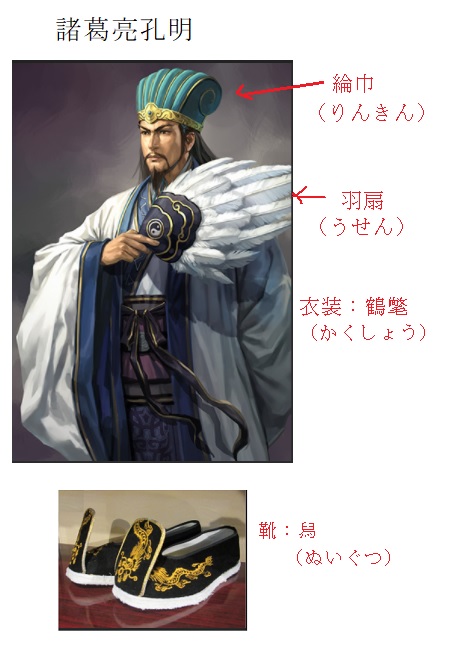 チャイナ、三国時代、皆さんご存知の英雄、諸葛亮孔明(しょかつりょうこうめい)。 さて、その彼の服装や持ち物の名称をご存知でしょうか? 大まかな物を説明します。 孔明は「白い輿(みこし)に載って頭巾をかぶり羽扇を手に持って軍を指揮した」<『初学記(しょがくき)』>とある。 そこから、三国志演義では、綸巾を被って羽扇を手にした姿になり、定着した。