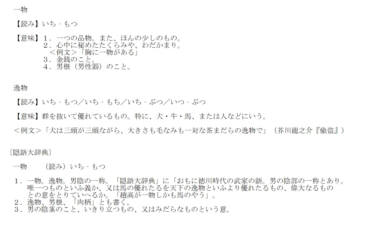 〇一物(いちもつ) ・・・ 男根のこと。男性器のこと。