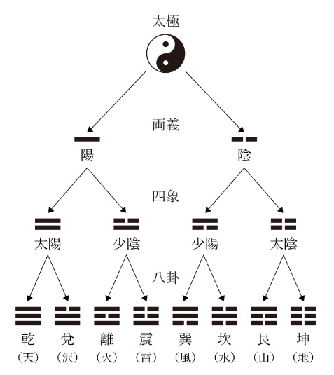 中心思想は、陰陽 二つの元素の対立と統合により、森羅万象の変化法則を説く。